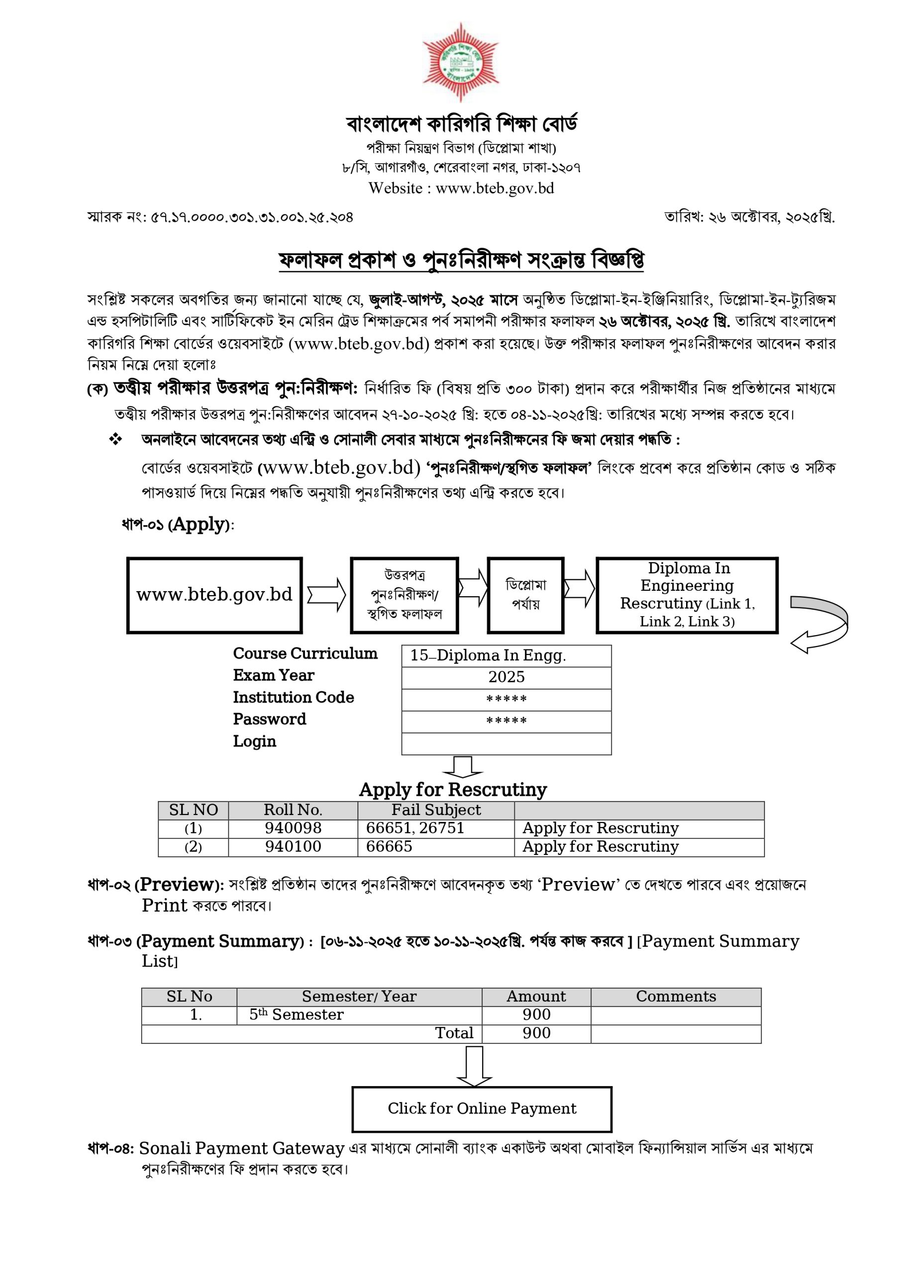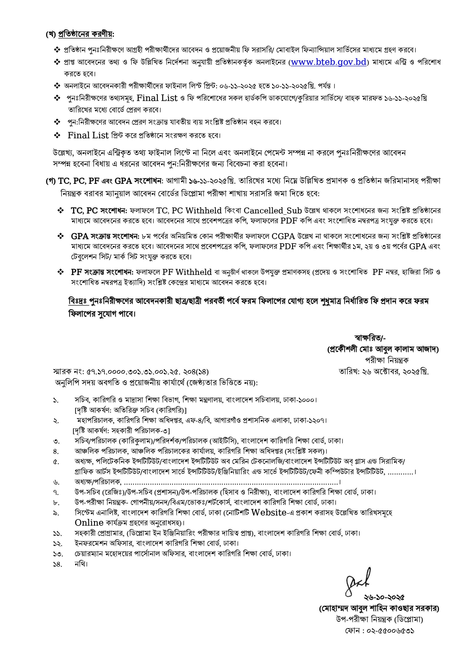 ডিপ্লোমা ইন ইঞ্জিনিয়ারিং শিক্ষাক্রমের (জুলাই -আগস্ট, ২০২৫ খ্রি. মাসে অনুষ্ঠিত) পরীক্ষা-২০২৪ এর পুনঃনিরীক্ষণ সংক্রান্ত বিজ্ঞপ্তি প্রকাশ